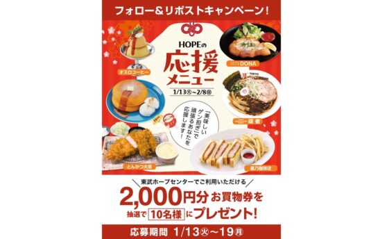 1/13(火)~2月8(日)まで、HOPE食堂にて「HOPEの応援メニュー 」を開催! …