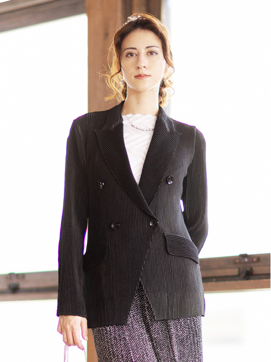 トレンドのピークドラペルに、身幅に程良くゆとりを持たせたダブルブレストデザインと、メンズライクなルックスを持ちつつ高め位置でウエストをやや絞った女性らしいシルエットが魅力です。
