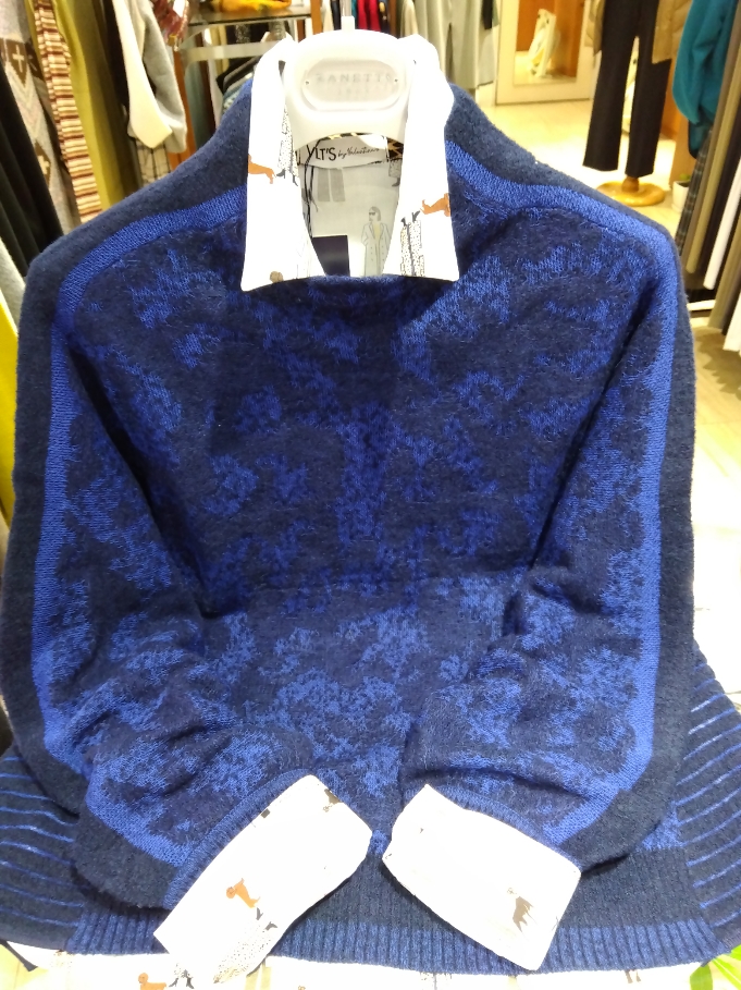 前身と後身がジャガード編みのボトルネックトップス。