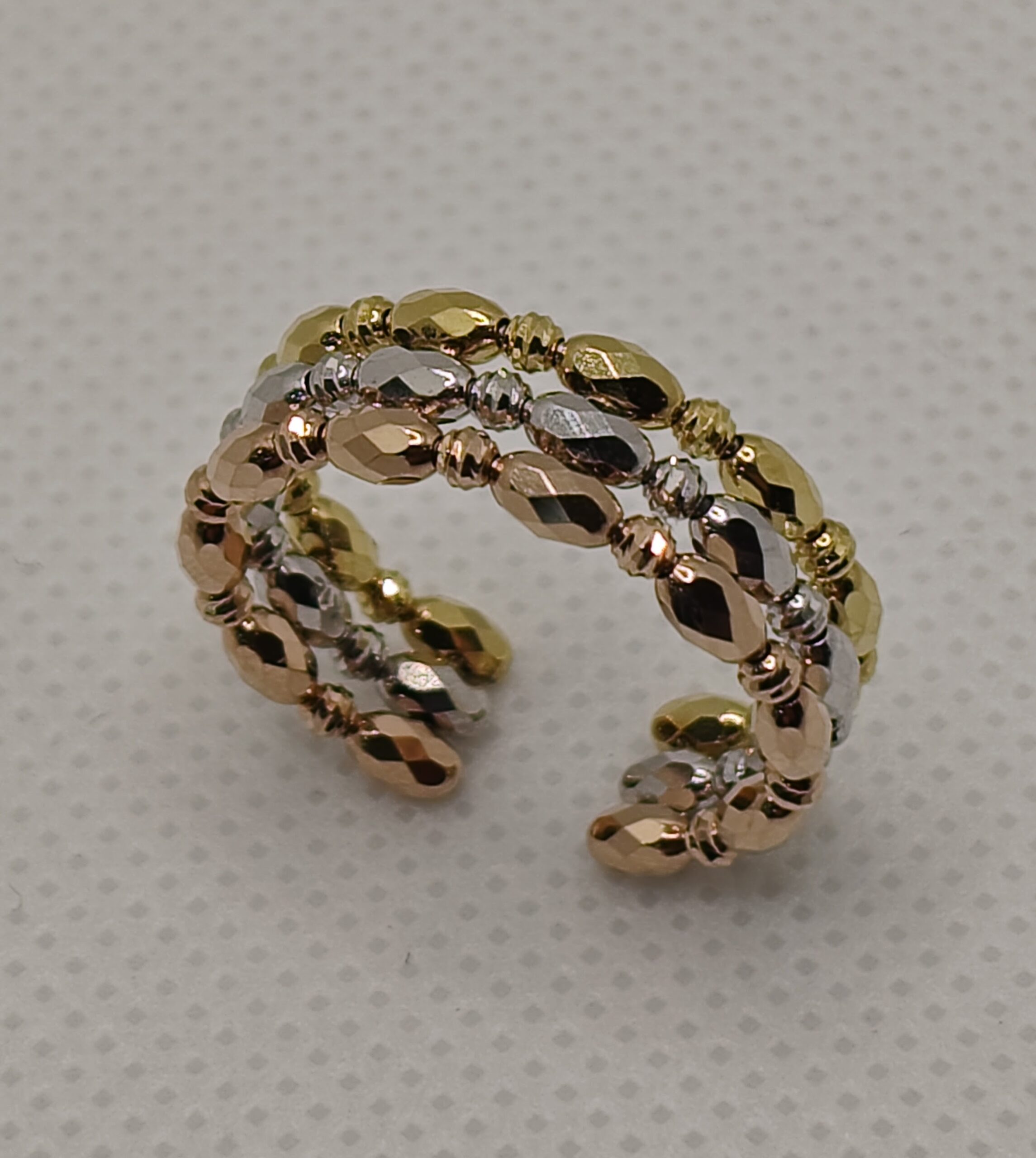 形状記憶加工をしたワイヤーが弾力性と心地良いフィット感を実現させたスリーカラー フリーリングです。