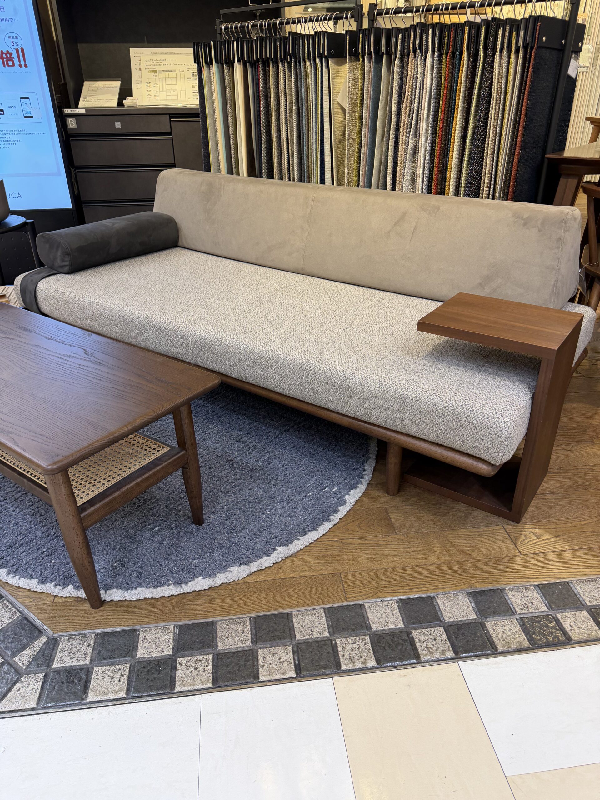 2サイズ(W1,500 or W1,800)、2色のフレーム色(M色 or WN色)、150色近い生地からカバー生地がお選びいただけ、カバーは座面と背面で変えるコンビ張りも可能です。