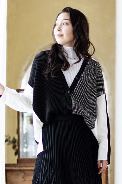 シンプルなトップスの上からさらっと羽織るだけでも、しっかりスタイルが決まる異素材切替カラーブロックデザイン。