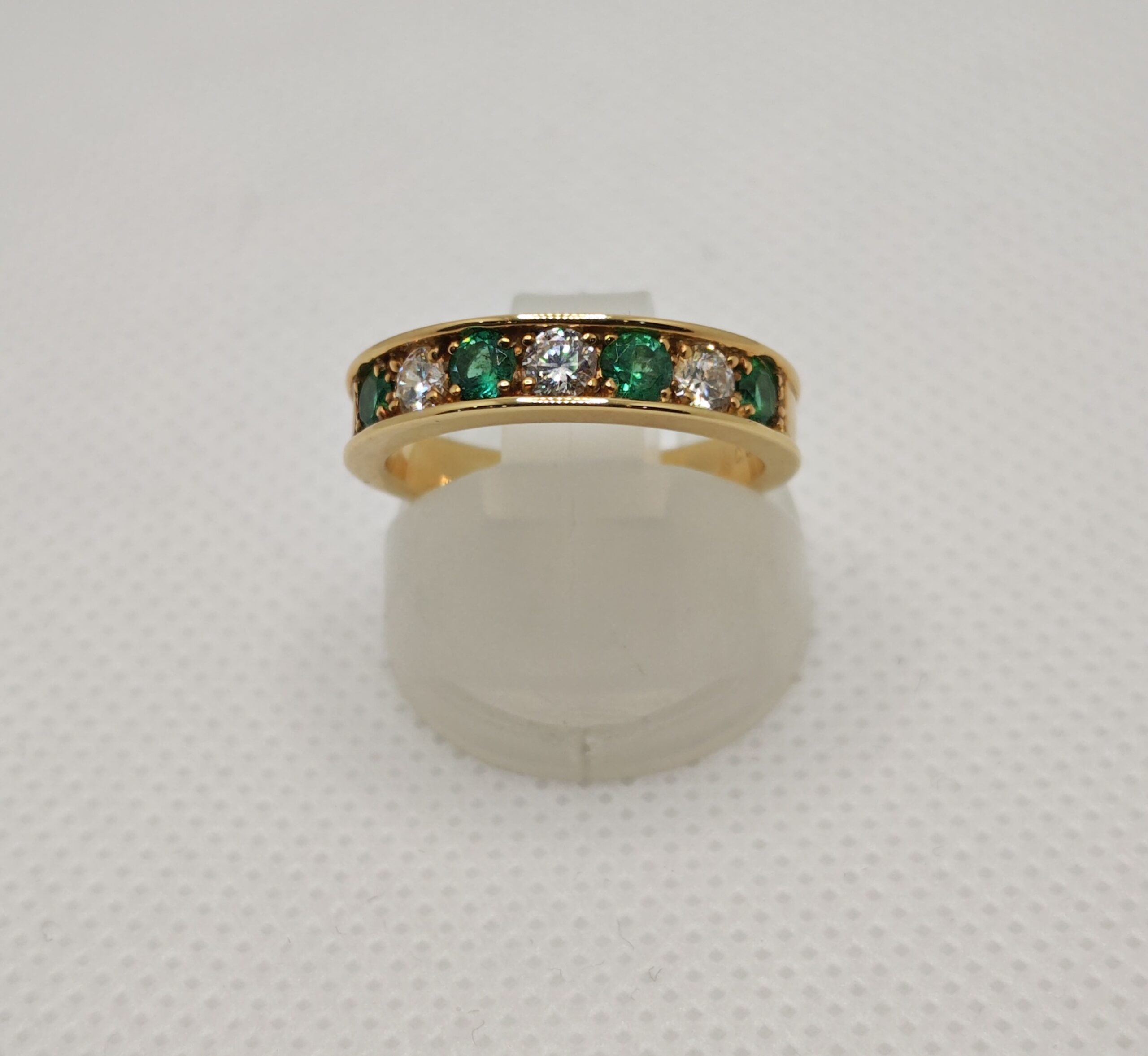 K18地金に、エメラルドとダイヤモンドを交互に配した一文字リングです。