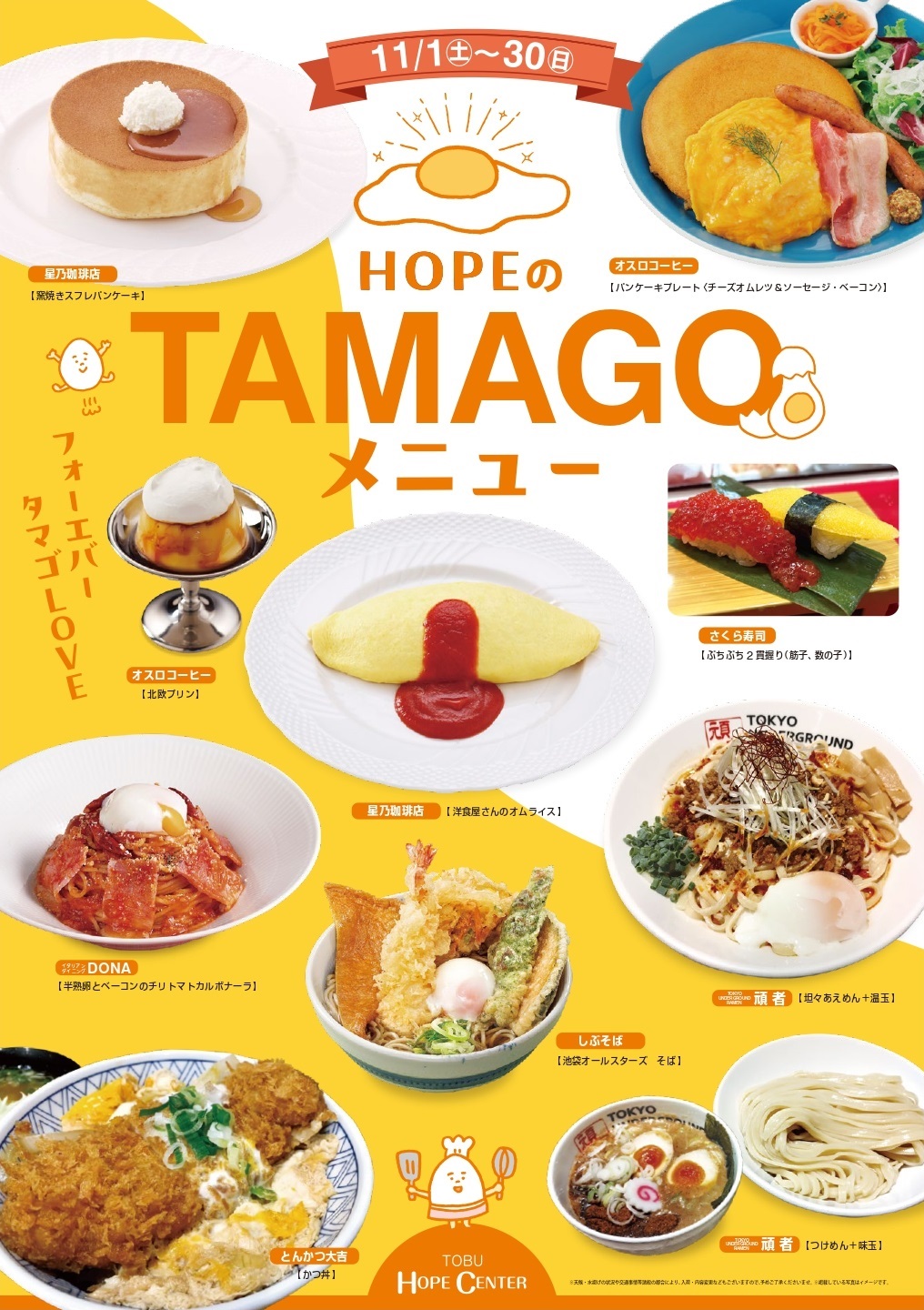 11/1(土)~30(日)まで、HOPE食堂にて「HOPEのTAMAGOメニュー 」を開催!