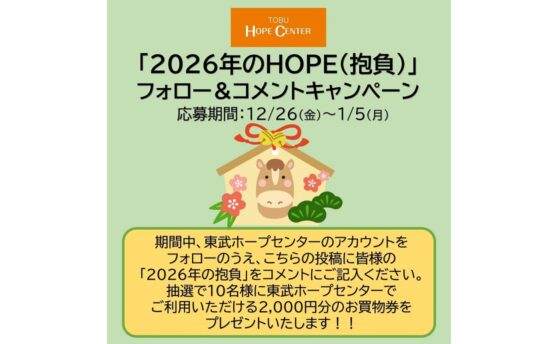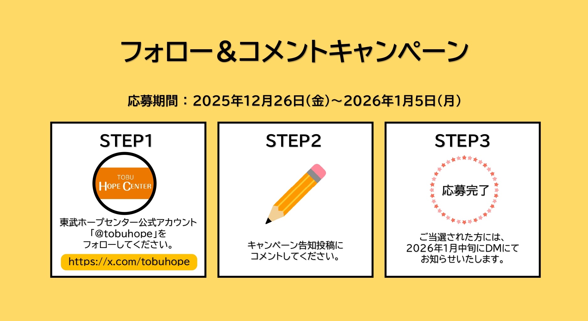 東武ホープセンター(以下「当店」といいます。)が主催する、フォロー&コメントキャンペーン(以下「本キャンペーン」といいます。)に応募いただく前に、本規約をよくお読みいただき、同意の上ご応募ください。