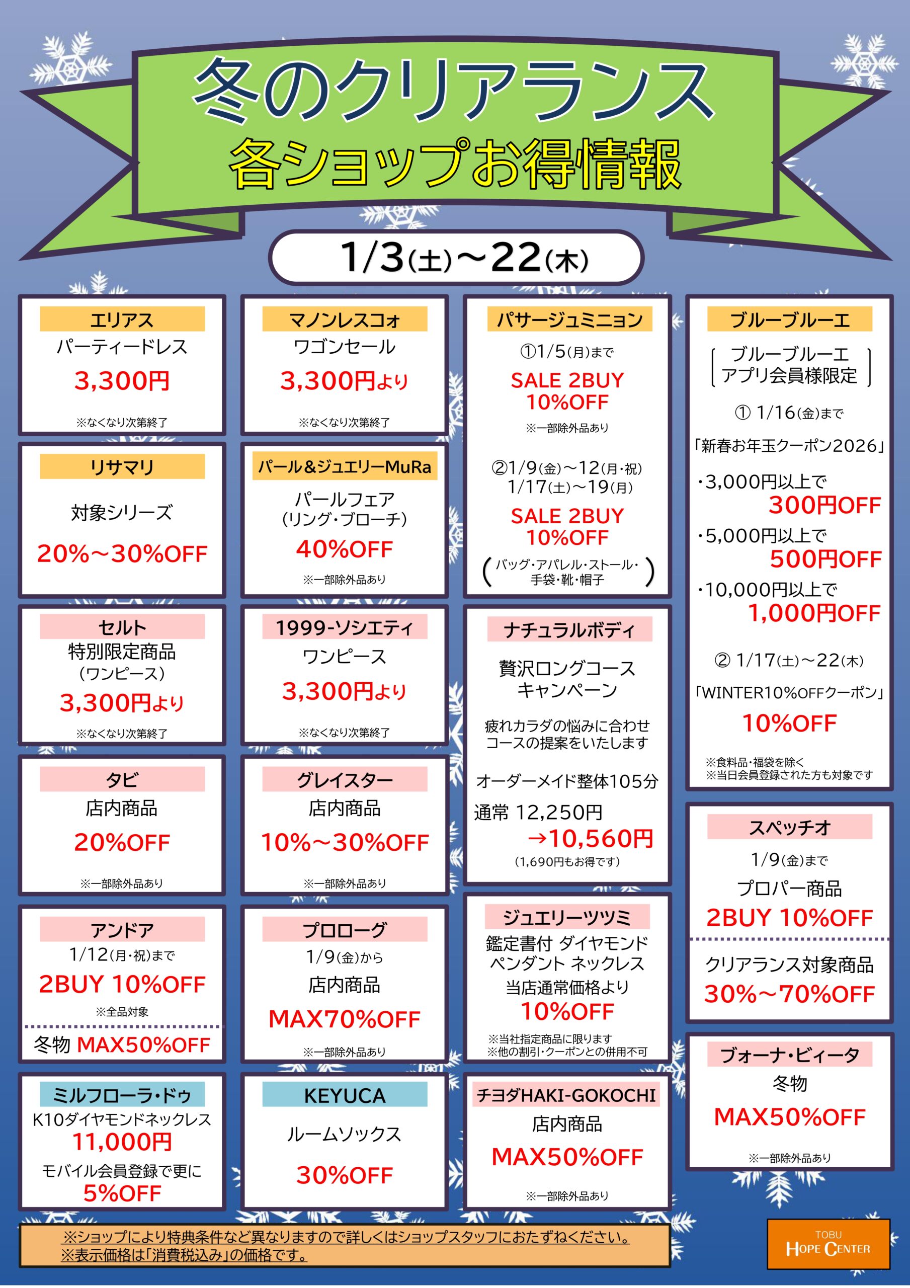 1/3(土)~22(木)まで、「冬のクリアランス」を開催!