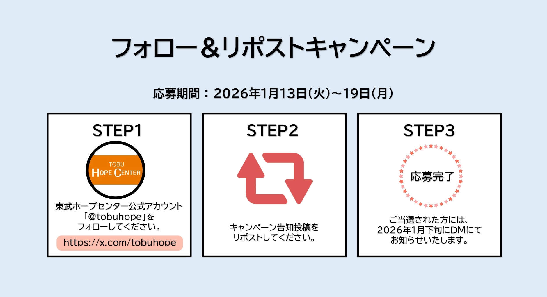 東武ホープセンター(以下「当店」といいます。)が主催する、フォロー&リポストキャンペーン(以下「本キャンペーン」といいます。)に応募いただく前に、本規約をよくお読みいただき、同意の上ご応募ください。